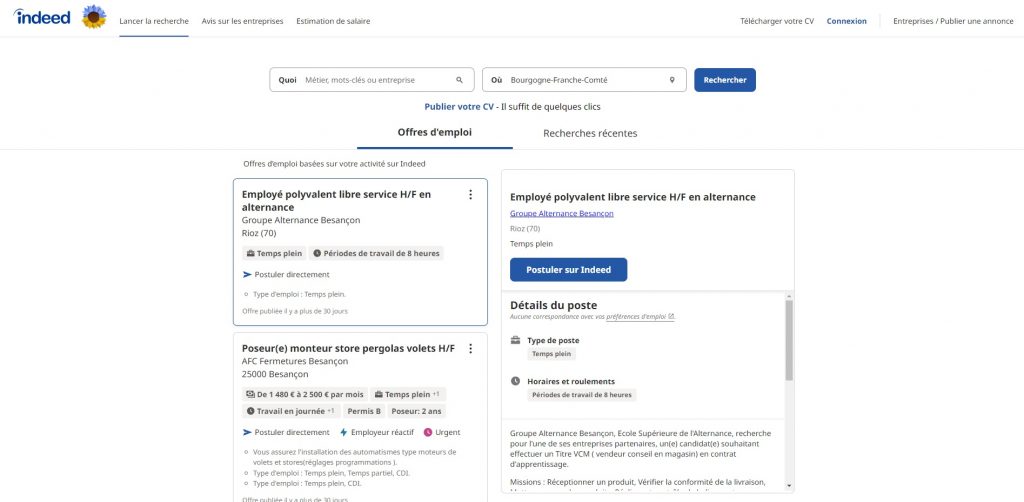 Indeed est un énorme méta-moteur américain qui regroupe les offres d’emploi de nombreux sites en un seul endroit. Il compile également des informations provenant de différentes pages de carrière de l’entreprise et vous permet d’effectuer des recherches à l’échelle locale ou mondiale. Et aussi de déposer votre CV. Attention, le moteur de recherche a la désagréable habitude de reprendre des offres qui ne sont plus d’actualité…
