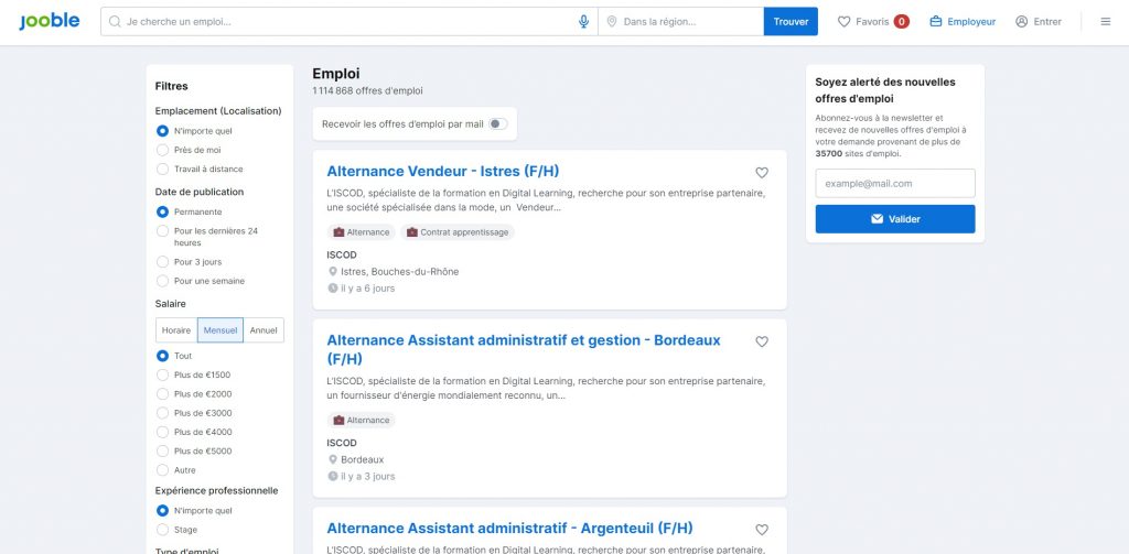 Né en 2006 à Kiev en Ukraine, Jooble met gratuitement des centaines de milliers d’offres d’emploi en provenance de milliers de sites d’emploi, de recruteurs et d’entreprises à la disposition des chercheurs d’emploi. Le moteur de recherche qui, en plus de la France, est présent dans 65 pays dans le monde, est en constante évolution et indique éliminer les offres identiques et celles n’étant plus d’actualité.