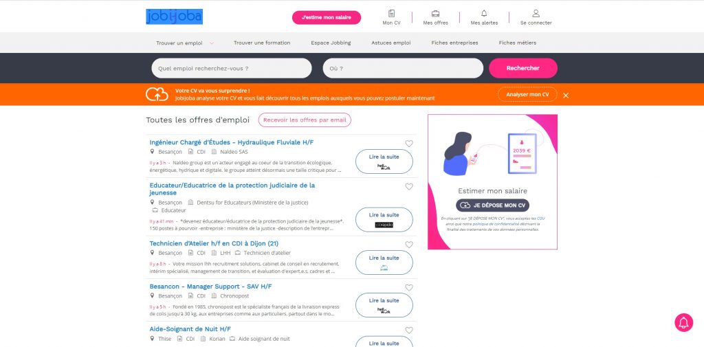 Un moteur de recherche français qui travaille avec 400 sites partenaires en France et 900 à l’international. Un parti pris d’interface un peu plus élaboré que la barre de recherche classique et on y trouve des contenus intéressants (ce que les concurrents n’ont pas encore tous mis en œuvre) pour les chercheurs d’emploi.